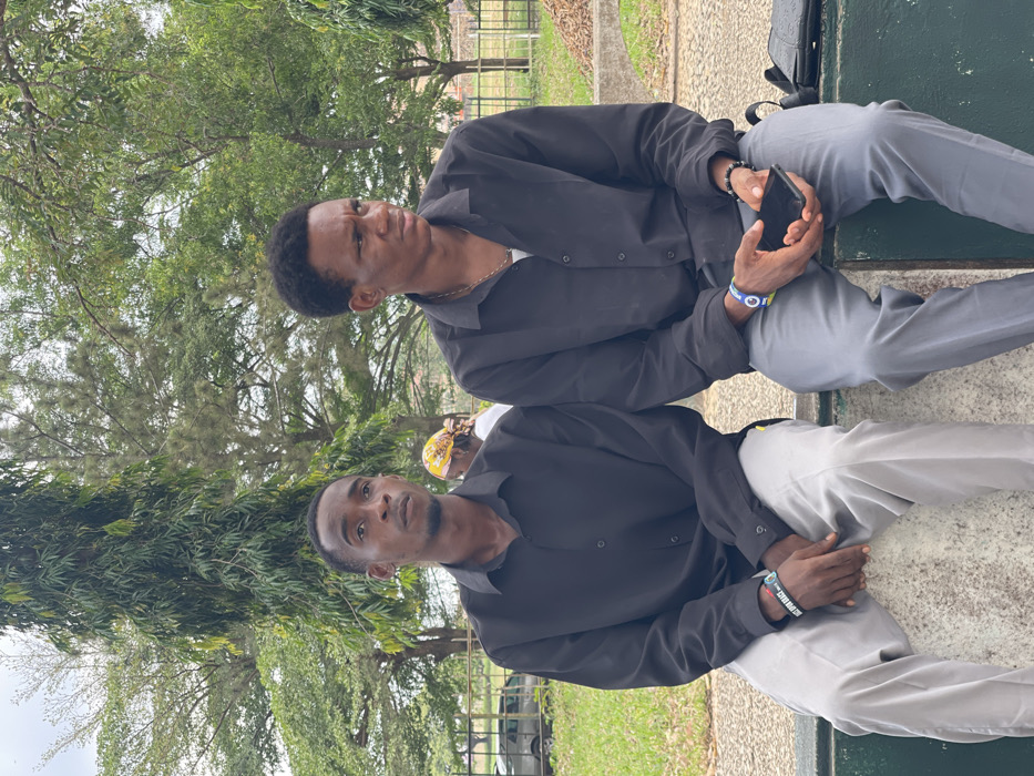 The image depicts two young adult males seated outdoors in the city of Uturu, Nigeria. Both individuals are of African descent and wear black long-sleeved button-up shirts and light grey trousers. They are seated on a low, light-colored concrete wall or bench. The male on the left has short dark hair and light facial hair, gazing straight ahead with a neutral expression. He wears two wristbands on his left wrist: one black with white text, and another dark-colored band with a green symbol. The male on the right has short dark curly hair and is looking towards his right (viewer's right) with a slightly furrowed brow. A silver-colored chain is visible around his neck. He wears a blue and yellow wristband and a black beaded wristband on his left wrist. He is holding a black smartphone in both hands, resting on his lap. A dark bag is partially visible beside him to his right. In the mid-background, positioned between the two males, a third person is partially visible, wearing a yellow headwrap and a white garment, facing away from the camera. The background is dominated by dense green foliage, including tall, slender trees and broader leafy canopies, with patches of green grass. In the far background on the left, a grey vehicle is partially visible behind a fence.