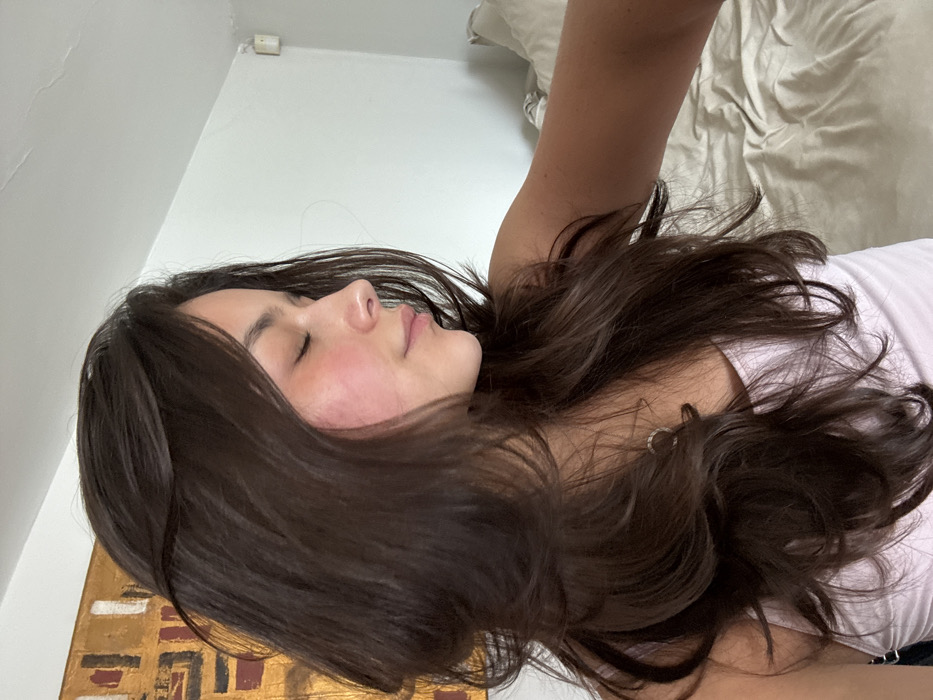 The image displays a female individual, observed in profile, with her eyes closed and head slightly tilted forward and to the left