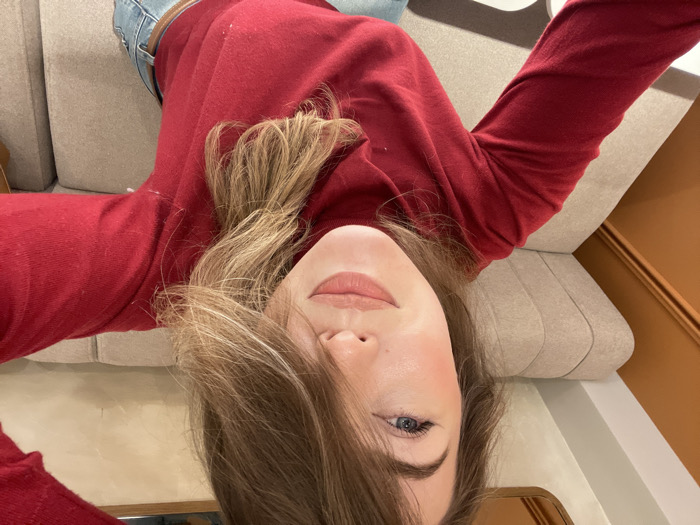 This image depicts a single female subject indoors. The specific location within the city of Kommunarka, Russia, cannot be determined from the visual evidence. The subject, a fair-skinned individual estimated to be in her 20s or 30s, is captured in a high-angle selfie. Her blue right eye is visible, while her left eye and a portion of her forehead are obscured by her light brown to blonde hair, which cascades over the left side of her face. She is wearing a dark red, long-sleeved top, possibly a sweater or turtleneck, and light blue denim jeans with a brown belt visible at the waistline. Her lips are a muted pink or nude shade. The background features a light beige or grey upholstered sofa with vertical ribbing, occupying the lower and right portions of the frame. To the upper left, a wall displays color blocking, with a prominent rust-orange section separated by a thin white stripe from an upper light beige or off-white section. A dark, rectangular object, possibly a mirror or frame, is partially visible at the top edge of the frame. The scene is illuminated by indoor lighting.