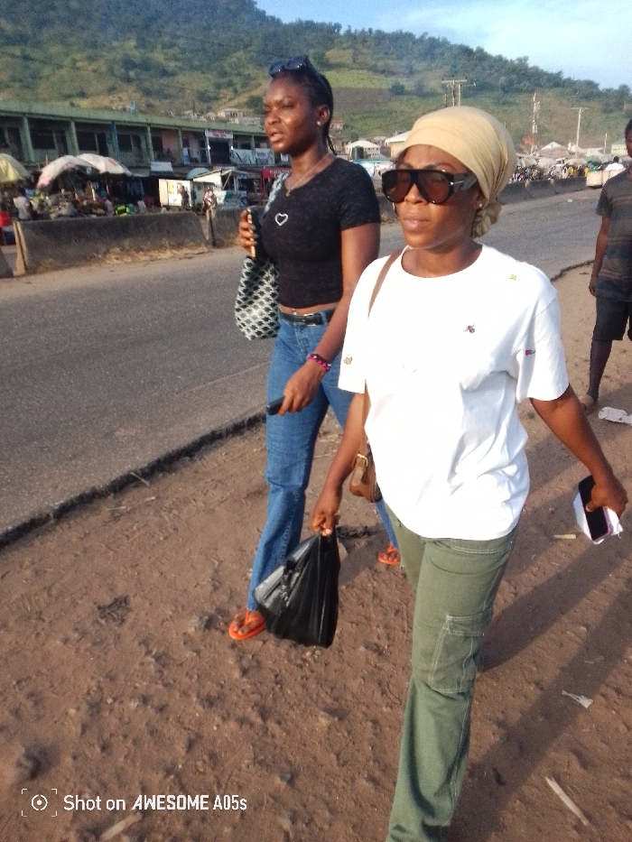 The image depicts an outdoor roadside scene in Lokoja, Nigeria, likely during daylight hours with soft, ambient lighting. In the immediate foreground, a female subject walks towards the viewer's left. She wears a light-colored headwrap, dark sunglasses, a white short-sleeved t-shirt with small embroidered patterns, olive green cargo pants, and a light brown shoulder bag. She carries a black plastic bag in her left hand and a smartphone with a white case in her right hand. Slightly behind and to the left of the foreground subject, a second female subject walks in the same general direction. She wears dark sunglasses resting on her head, a black short-sleeved crop top with a white heart emblem on the chest, blue jeans, and orange open-toed sandals. She carries a black and white patterned tote bag on her left shoulder and holds a dark-colored smartphone in her right hand. The environment features an unpaved, reddish-brown dirt shoulder in the foreground, adjacent to a grey asphalt paved road. A low concrete barrier separates the dirt shoulder from the road in the midground. In the background, a row of single-story commercial buildings with green roofs is visible, fronted by several market stalls with umbrellas or tarps, indicating a bustling commercial area. Distant green hills or mountains form the horizon line. A partially visible male figure in a striped shirt and shorts is present on the far right background. Utility poles are also discernable in the distant background.