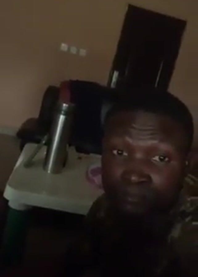 A man is recording a selfie video indoors. He is looking directly at the camera with a serious expression. Behind him, there is a small white table with a silver thermos on it, a black chair, and a dark door in the background. The room has a light orange-colored wall. The lighting is dim.