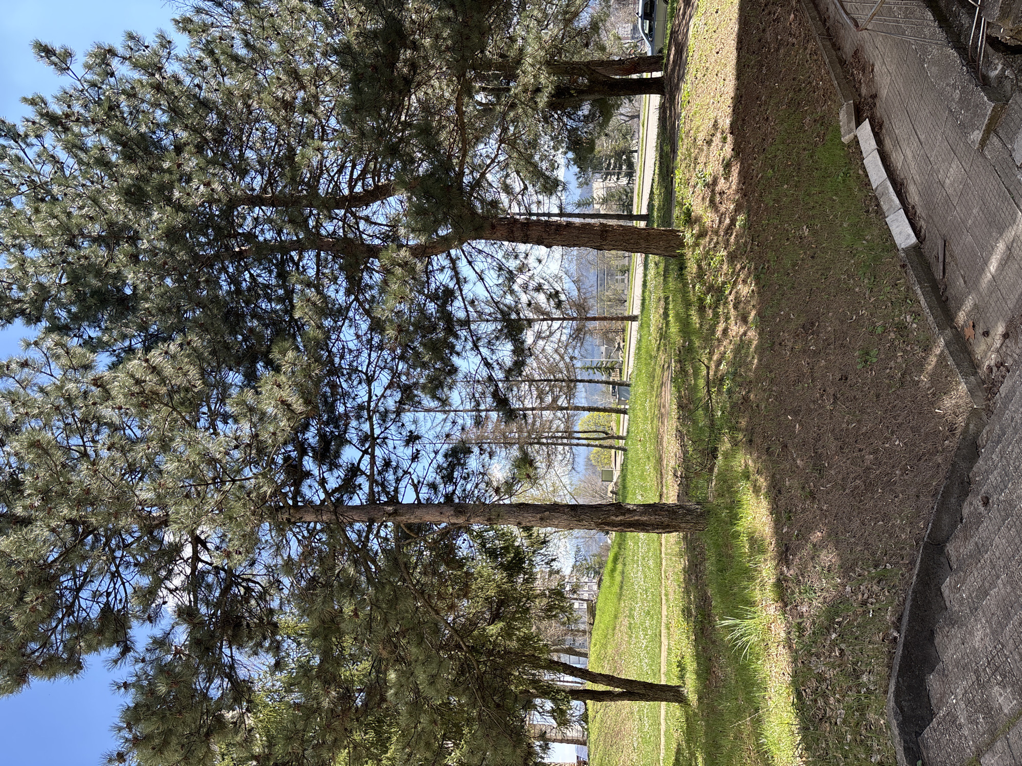 The image presents a view in Ledenik, Bulgaria, dominated by several pine trees lining an edge bordering a street. The trees' canopies fill the upper left quadrant of the frame, contrasting with patches of sky visible between branches. The lower ground displays grass and some areas of bare earth. To the right, a concrete sidewalk or retaining wall marks a significant slope. The perspective suggests the photo was taken from an elevated position looking down. In the distance, buildings and hills are visible through the trees.