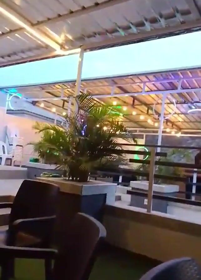 n outdoor restaurant seating area, likely on a rooftop. There are tables with black chairs, some with what looks like a chessboard pattern on top. A small potted tree sits on a ledge, with a railing separating the seating area from another level. The upper level is also decorated with plants and has additional seating. String lights are strung across the ceiling, providing illumination. The roof is a metal structure. Music is playing. The sky is visible above the rooftop, appearing pale in the evening light. The camera appears to be hand-held and slightly shaky.