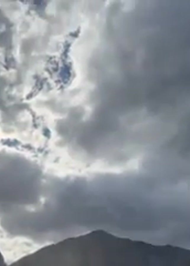 The video opens with a wide shot of a mountainous landscape under a cloudy sky. The sun attempts to break through the cloud cover. The camera then tilts upward, focusing on the sky, revealing patches of blue amidst the thick clouds. The clouds vary in color from white to dark gray. The video then shows the sky upside down, with a thin strip of mountain visible along the horizon. The clouds remain the primary focus of the shot.