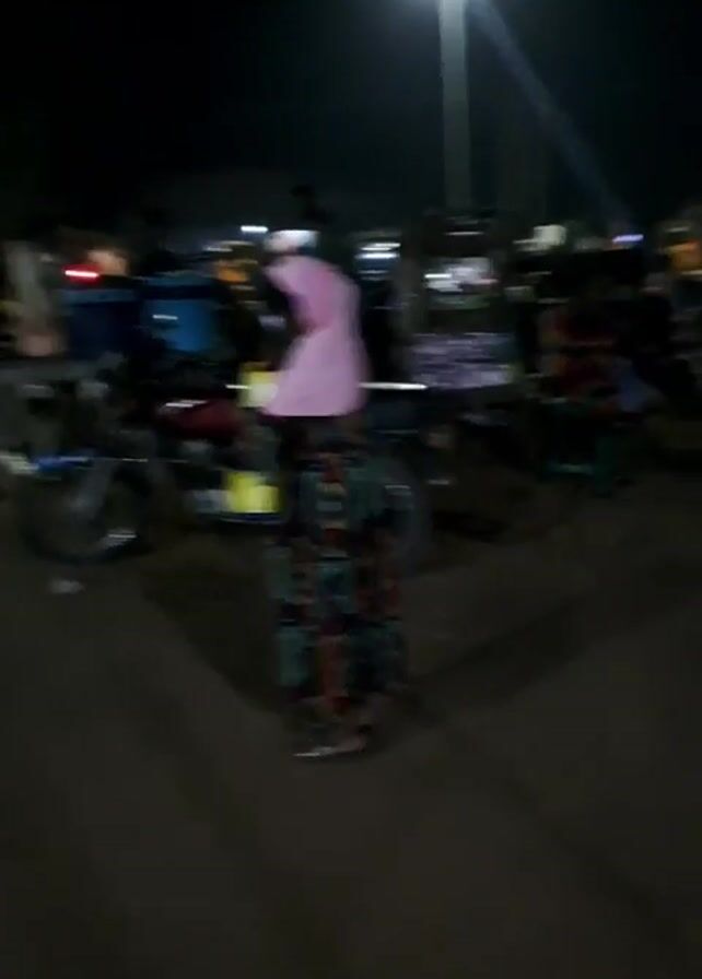 busy nighttime scene at an outdoor market or gathering in what appears to be a developing country. The scene is lit by overhead streetlights, casting strong shadows. Several people are visible, some standing near makeshift stalls or tables. A woman wearing a colorful patterned dress and a pink headscarf stands out, though her back is to the camera. Several motorcycles are parked nearby, and a yellow three-wheeled vehicle is also visible. The ground appears to be uneven, possibly dirt or gravel, with some trash scattered around. The general atmosphere seems lively with people moving about and engaging in commerce.
