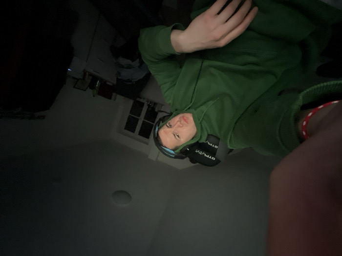 The image displays an indoor room in Benningen, Germany, under low illumination. A young adult male occupies the foreground, facing the camera. He is wearing a plain green hooded sweatshirt and a blue-green over-ear headset. A red and white braided bracelet is visible on his left wrist. His left arm is partially visible, extending towards the camera, indicative of a self-portrait. The male exhibits a neutral facial expression. Behind him, a black gaming chair featuring "GTPLAY" branding is discernible. The room's background includes light-colored walls, a ceiling-mounted circular light fixture, and a multi-paned window. Below the window, a white dresser or cabinet is present, holding several small, indistinct objects. Light-colored textiles are observed on surfaces within the room, and a dark, vertical object is partially visible on the far right.