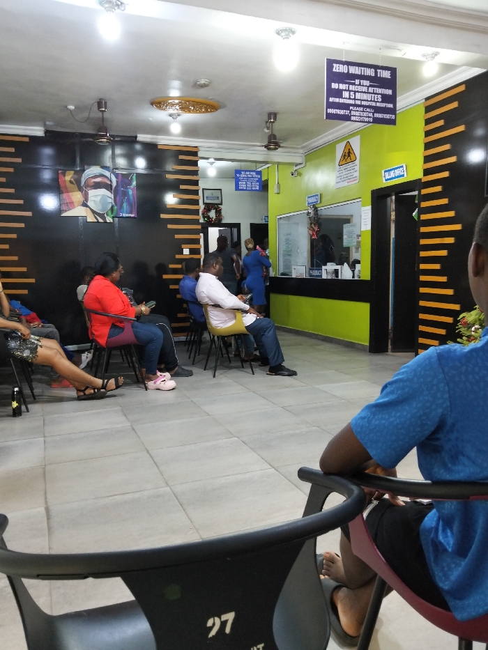 This image captures the interior waiting area and reception of a Dr. J-Master Multispecialty Hospital branch, located in Port-Harcourt, Nigeria. The room features a light grey tiled floor and segmented walls; some sections are black with horizontal brown-orange strips, while others are bright lime green. The white ceiling is fitted with multiple circular LED lights and two dark-bladed ceiling fans. A golden decorative medallion is centrally affixed to the ceiling. Approximately eight individuals are present, primarily seated in black chairs with metal frames. In the immediate foreground, partially obscured, a person sits facing away from the camera in a chair marked "27", wearing a blue patterned shirt and dark shorts with slides. To the left, a woman in a red top and blue jeans, wearing pink slippers, is seated, looking at a smartphone. Further left, another person displays bare legs and black sandals, with a small brown bottle positioned on the floor nearby. A man in a light-colored collared shirt and dark trousers is also seated in this row. In the background, a reception or pharmacy counter with a glass partition is visible along a lime-green wall. A "PHARMACY" sign is mounted above this counter. An individual in a blue uniform or dress stands interacting at the counter, while another staff member is visible behind it. Adjacent to this counter is a doorway labeled "BILLING OFFICE". Several signs are displayed: a purple hanging sign reads, "ZERO WAITING TIME - IF YOU DO NOT RECEIVE ATTENTION IN 5 MINUTES AFTER REACHING HOSPITAL RECEPTION PLEASE CALL" followed by Nigerian phone numbers. A blue sign identifies "DR. J-MASTER MULTISPECIALTY HOSPITAL - ABUJA OFFICE" with associated phone numbers. A yellow triangular warning sign is also present. On a black wall section, a large poster depicts a person in a surgical mask, with "J-Master" text. A small decorative wreath hangs on a black wall near a doorway in the background. A CCTV camera is visible near the ceiling in the reception area.