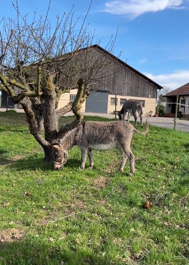 - "The scene shows two donkeys grazing in a green field on a sunny day" by FM-sL8Ne2, licensed under CC BY 4.0