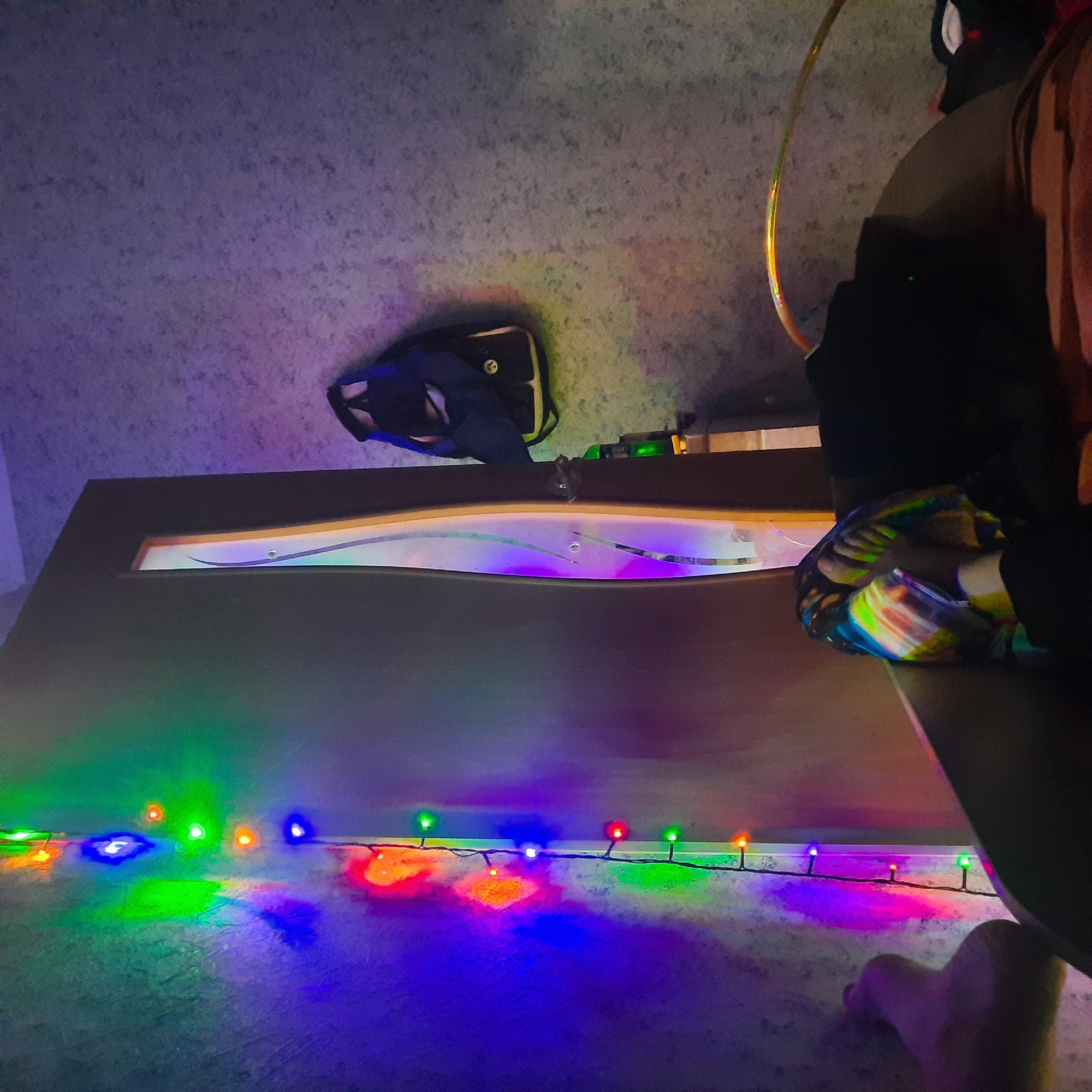 This image depicts an interior room in Kurganinsk, Russia, observed from a low, reclining perspective. A string of multicolored LED lights (red, orange, green, blue, purple) is affixed vertically to a textured wall on the left, illuminating the space and casting color reflections onto the wall. To the right, a dark-colored interior door is partially open, revealing a vertical translucent panel that also reflects the lights. A dark bag or backpack hangs on the wall to the right of the door. In the foreground, the lower extremities of a person are visible: a bare left foot and a right leg covered in patterned fabric that reflects the multicolored lights. Part of a bed or sofa with reddish-brown bedding is discernible in the lower right corner, and a curved, reflective object is present in the upper right.