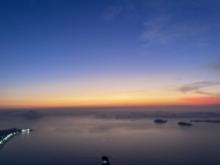 An aerial shot shows a gradient sky transitioning from blue to orange and pink at the horizon during either sunrise or sunset. Below, a body of water reflects the sky's colors, obscured by a layer of fog or mist. Along the left edge, a coastline is visible with a string of lights. In the distance, small islands dot the water. A small dark figure, possibly a phone, is visible at the bottom center of the frame. The overall image is soft and slightly out of focus.