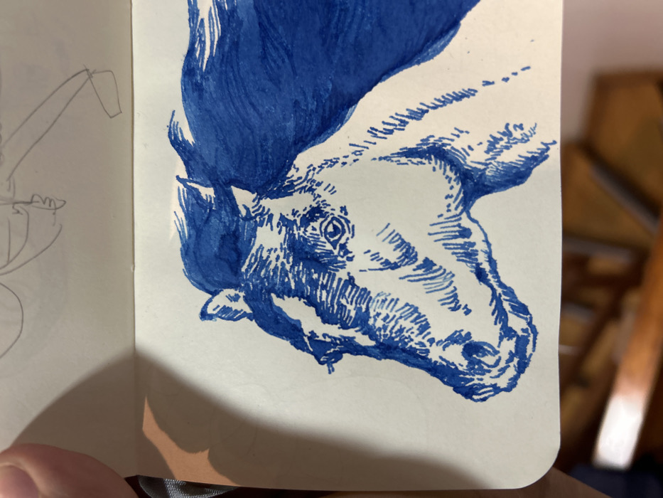 A striking blue pen sketch captures a horse's head. Its mane is rendered in dense, dark blue strokes, creating a sense of volume. The horse's facial features are outlined with short, deliberate lines, defining its eye, muzzle, and the contours of its face. The artwork is on the right page of a sketchbook, with a faint pencil drawing on the left.