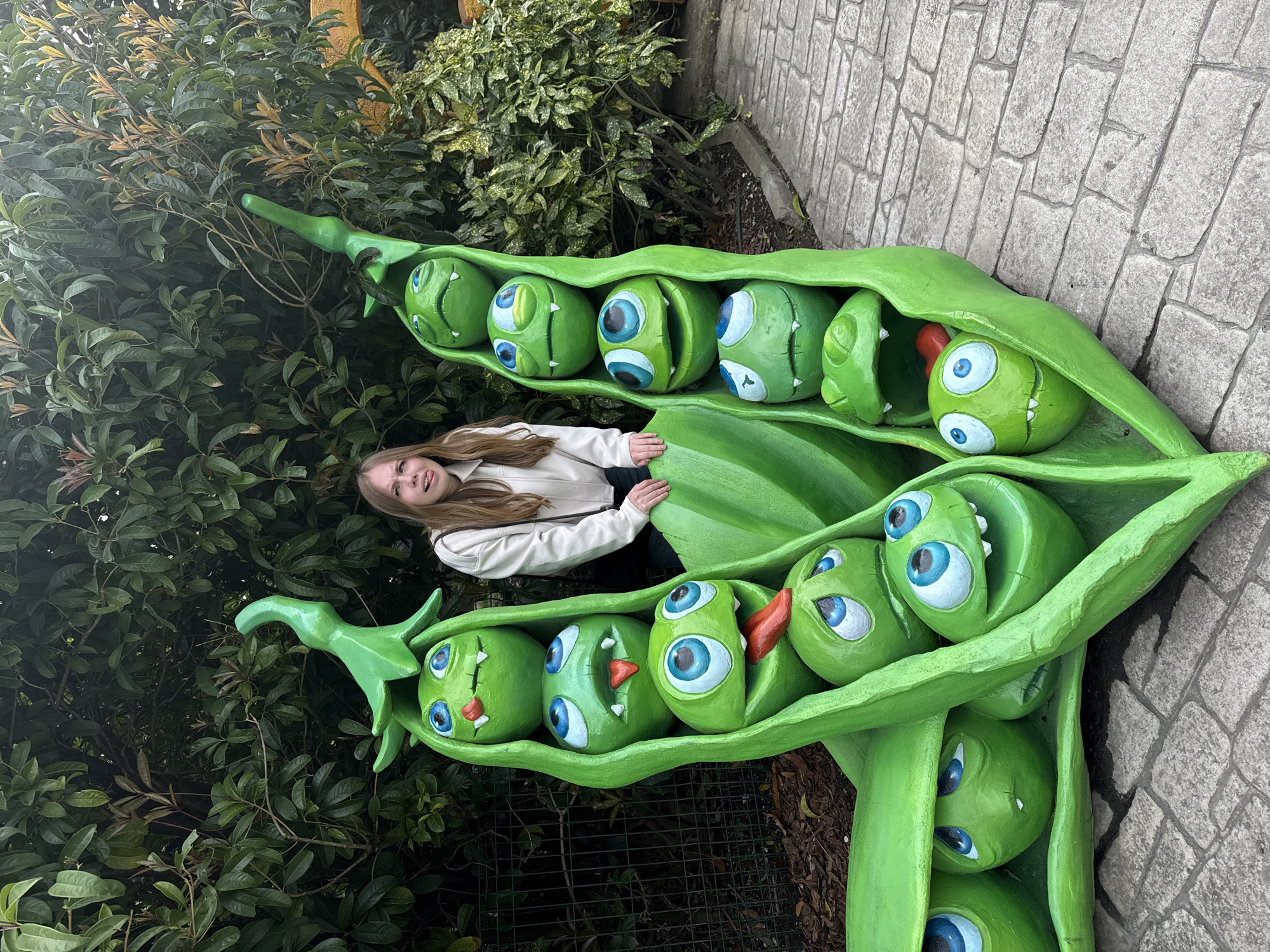 An outdoor scene captures a young woman interacting with a large, whimsical sculpture in Sochi Park, Sochi, Russia. The sculpture consists of two oversized, bright green pea pods, each containing multiple anthropomorphic pea characters with exaggerated features. The woman, with long light brown hair and wearing a light-colored jacket over dark clothing, is positioned centrally behind the left pea pod, crouching slightly with her hands resting on the sculpture. She looks directly towards the camera, her facial expression characterized by a playful grimace with her tongue extended to the side. The pea pods are open, revealing their spherical inhabitants. Each pea character is green with large blue and white eyes. Several display open mouths with pointed white teeth, and some have red or pink tongues protruding. Their expressions vary from surprised to mischievous. The left pea pod appears to contain five characters, one positioned above the woman's head. The right pea pod contains six characters. The background consists of dense green foliage from various bushes and trees, with some leaves exhibiting reddish-brown accents. A dark mesh fence is visible behind the left side of the sculpture. The ground surface is a pathway paved with grey, rectangular interlocking pavers or stamped concrete, suggesting a park or amusement area setting. The lighting is even, without harsh shadows.