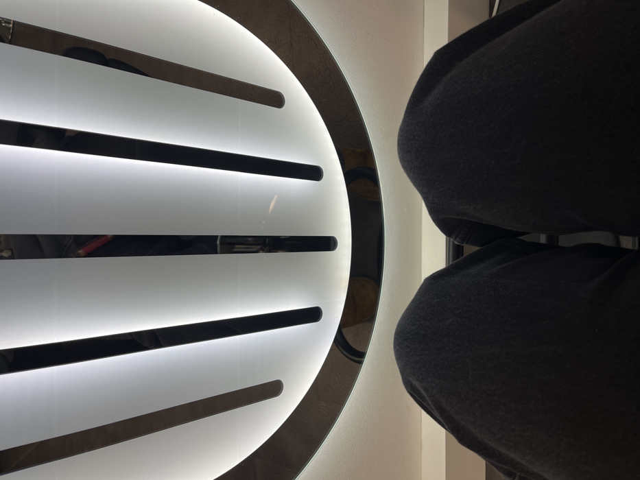 This image, captured in Meisenheim, Germany, presents an indoor scene from a low, seated, first-person perspective. The upper half is dominated by a large, semi-circular, overhead light fixture. This fixture features a reflective metallic, possibly chrome, frame outlining its arc. Within this arc, multiple (approximately seven to eight) vertical, rectangular, frosted white illuminated panels are evenly spaced, separated by narrow dark, non-illuminated gaps. Distorted reflections of the ambient environment, including what appears to be a reddish object, are visible on the metallic frame. The lower third of the image displays the knees and upper thighs of an individual, presumably the photographer, clad in dark-colored, possibly denim, trousers. The bent posture of the legs indicates the individual is seated. A narrow, light-colored horizontal surface is visible between the overhead fixture and the individual's knees, with a darker horizontal line beneath it. No other individuals or specific actions are discernible.