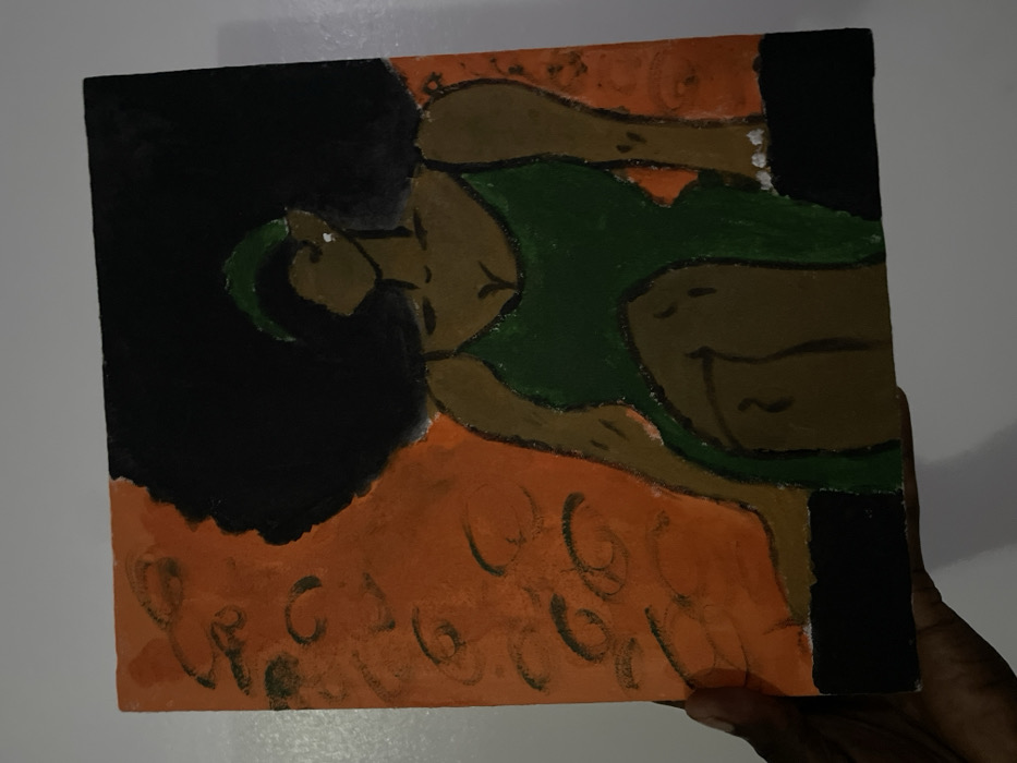 An abstract painting on a square canvas depicts a person with brown skin, wearing a green garment, reclining against a black background. The person's face is turned away, partially obscured by their dark, voluminous hair. The lower part of the painting features a warm orange color, with swirling, dark green markings scattered across the surface. The painting style is somewhat crude, with thick, visible brushstrokes and a lack of detailed features.