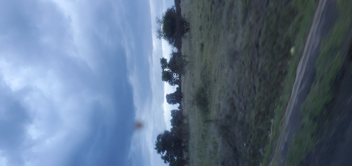 The image depicts an outdoor landscape scene under an overcast sky, specified as being in Mua ward, Kenya. The upper portion of the frame is dominated by dark grey and blue-grey clouds, indicating diffused light conditions. Below the horizon, the terrain consists of an expansive, relatively flat grassland populated by numerous scattered trees and shrubs of varying sizes. The vegetation is characterized by muted greens and browns, consistent with savanna or dry bushland. The immediate foreground features a dark, blurry strip, consistent with a road or dirt track, with adjacent green ground cover. Significant motion blur is evident in the lower third of the image, indicating the photograph was captured from a moving platform. A small, indistinct reddish-brown circular artifact is visible in the upper-left quadrant. No individuals, animals, or artificial structures are discernible within the main landscape.