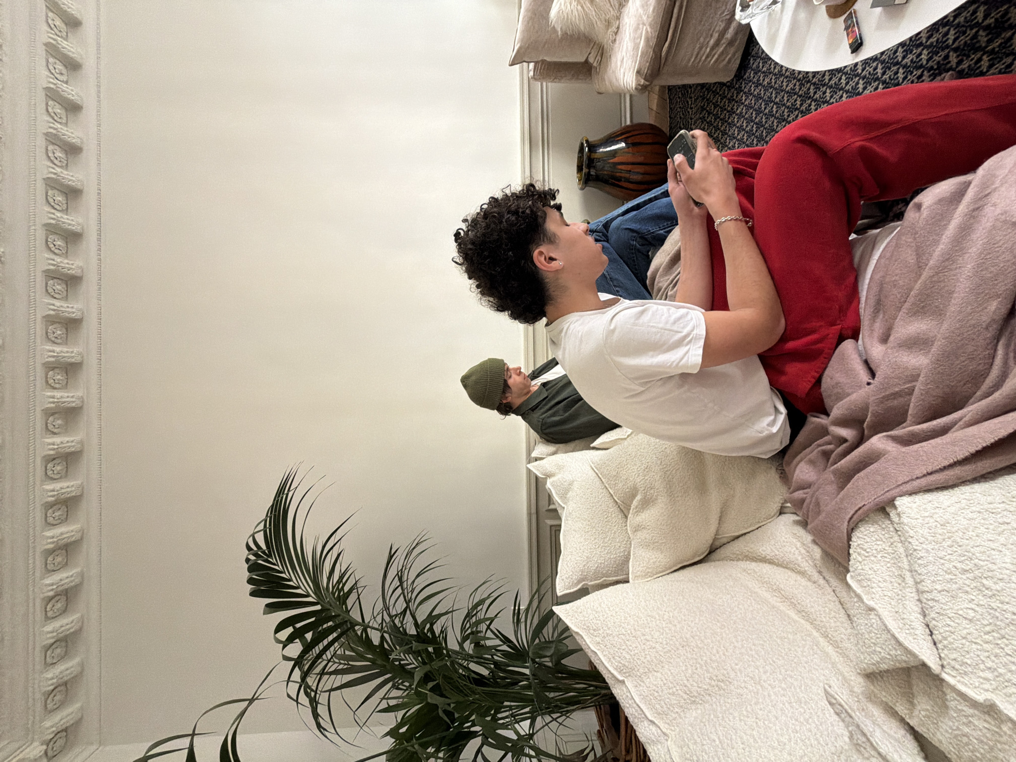 An indoor scene within a living space in Paris, France, features two males seated on a light-colored, textured sectional sofa. The environment is characterized by high ceilings and ornate crown molding consistent with Haussmannian architecture, with light-colored walls and a decorative dado rail or paneling. In the foreground, a male with dark, curly hair is positioned in profile, facing right. He wears a white t-shirt, red sweatpants, and a silver-colored chain bracelet on his left wrist. He is actively holding a dark-colored smartphone with both hands, directing his gaze downward at the screen. A mauve blanket is draped over the sofa adjacent to him. Behind him, further left on the same sofa, a second male is partially visible, also facing right with his head directed downwards. He wears a dark green beanie hat and a dark green or olive-colored jacket over blue jeans, appearing to be engaged with a personal electronic device. To the left, a large potted palm-like plant with dark green fronds stands in a woven basket planter. Between the sofa and a beige upholstered armchair on the right, a tall, dark brown and orange glazed ceramic vase is situated on the floor. A white circular coffee table, bearing minor items, is partially visible in the right foreground, resting on a dark patterned area rug. No direct interaction between the individuals is observed; both are independently occupied with their devices.