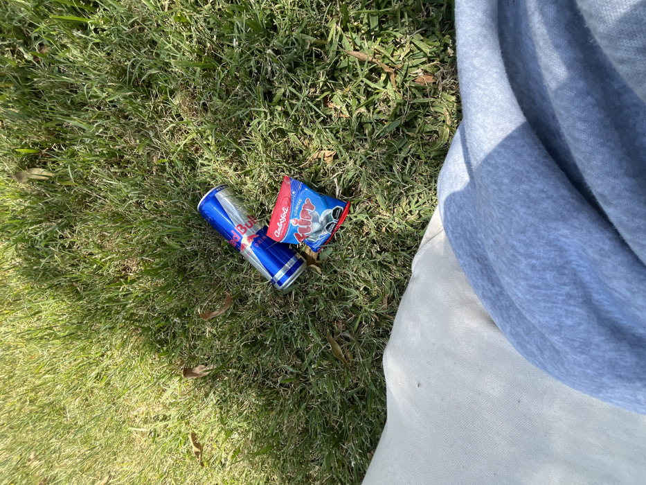 The image displays a localized scene on green grass, set within the city of Arica, Chile. Centrally located on the grass are two items: a blue and silver Red Bull energy drink can, positioned horizontally, and a small, red, blue, and white plastic package of Ambrosoli Slippy gummies, featuring the text "Gomitas" and a black octagonal "ALTO EN AZÚCARES" warning label. The lower portion of the frame reveals the legs of an individual, implying a seated or reclining posture on the ground. The left leg is covered by light-colored, possibly beige, fabric, while the right leg and lap area are obscured by blue-grey heathered fabric. The grass exhibits varying shades of green, with scattered brown organic material, suggesting natural outdoor conditions. Natural daylight illuminates the scene from above, casting subtle shadows. No direct actions or interactions are depicted, but the placement of the items indicates recent presence or use by the individual.