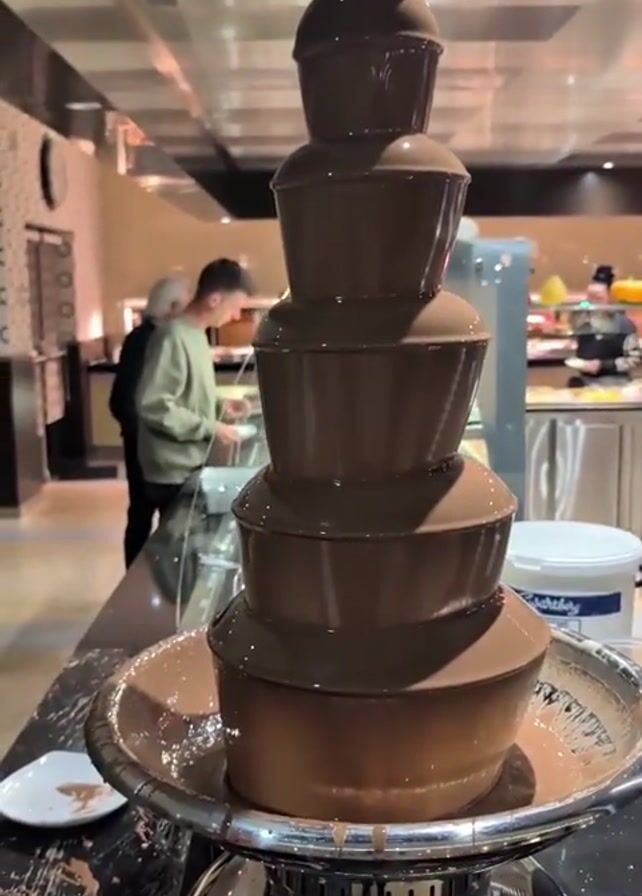 The video begins with a close-up of a chocolate fountain, the chocolate smoothly cascading down its tiers