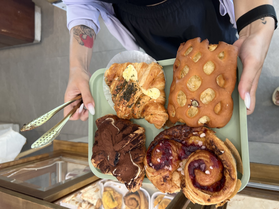 A first-person overhead view depicts a person holding a light green rectangular tray laden with four distinct baked goods inside a bakery in Ho Chi Minh City, Vietnam