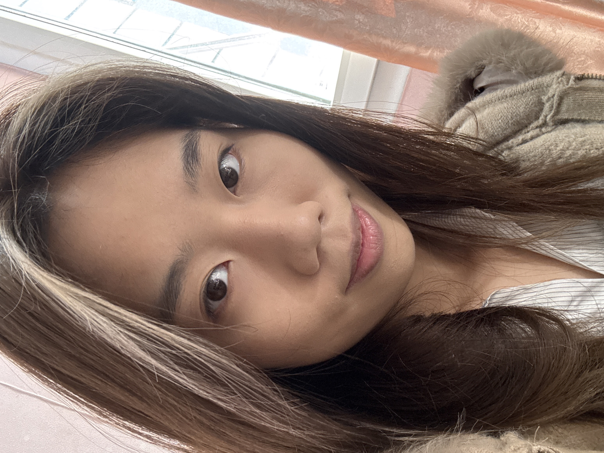 A close-up, tilted headshot of an East Asian woman with brown hair. The woman's face is pale and features brown eyes, a small nose, and light pink lips. Some strands of her hair are highlighted blonde. She appears to be wearing a white and grey striped shirt and a beige jacket with a fur-trimmed hood. A window with sheer curtains is visible in the background. The image does not provide enough information to determine the specific location in Shapingba District, China.