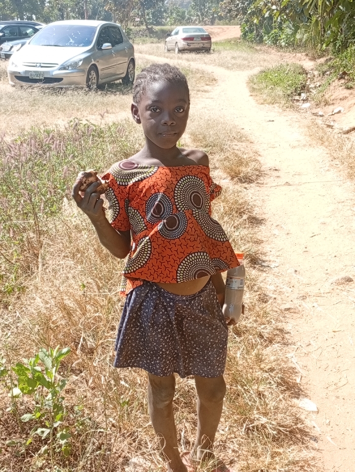 A young African child stands centrally on a dry dirt path in Unguwar Gaya, Nigeria, looking directly at the camera. The child has dark skin and short, dark hair, wearing an orange-red off-shoulder top with a black and white circular pattern, and a dark blue skirt with a light floral or dot pattern. She is barefoot. In her left hand, she holds an irregularly shaped brown object, consistent with a piece of food. In her right hand, partially obscured, she holds a clear plastic bottle with an orange cap, containing a light-colored substance. The immediate environment consists of dry, light brown earth with patches of dry grass and sparse green vegetation. In the background, a silver Peugeot 307 hatchback with a cracked windshield and license plate 0KA-547TS is parked on the left on dry grass. Further down the dirt path to the right, a lighter-colored sedan is also visible. The scene is illuminated by bright daylight.