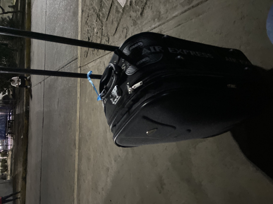A black suitcase with the words "Air Express" on the top sits on a grey paved surface. The suitcase has a black handle extended upwards and a blue string is tied to its side. In the background, a person is sitting on a bench and there is fencing visible in the far left. The scene is dimly lit.