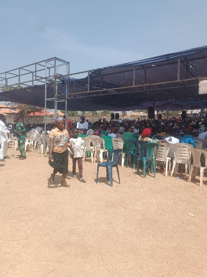 A large group of people are gathered under a metal structure covered with a dark canopy. Numerous white and green plastic chairs are arranged, occupied by attendees of the event. In the foreground, a woman and a young boy walk past a solitary blue plastic chair. The ground is a dry, light brown dirt surface. The sky is overcast with a pale blue hue, indicating an outdoor setting with a large crowd.