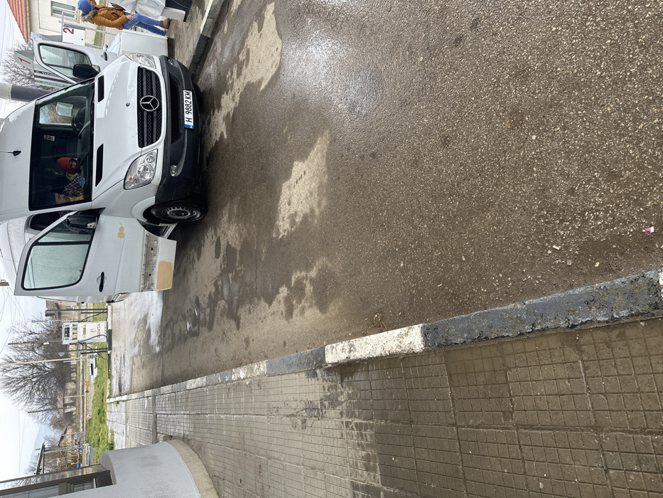 This image depicts a scene at a service area or gas station in Smyadovo, Bulgaria, under an overcast sky. A white Mercedes-Benz Sprinter van, bearing Bulgarian license plate H 9882 KM, is stationary on a wet asphalt surface. The front driver's side door and the driver's side sliding door are open, revealing areas of body repair with visible putty or primer on the lower section of the sliding door. Two individuals are partially visible inside the van's front cabin: one in the driver's seat wearing a blue hat and a plaid shirt, and another in the front passenger seat wearing a red hat. A third individual, wearing a yellow/orange hooded jacket and blue jeans, stands with their back mostly to the camera, positioned adjacent to a white fuel pump with "ZENITA" branding. A fourth person, largely obscured behind the individual in the yellow jacket, is also present near the fuel pumps. To the left, a concrete curb, painted in alternating black and white sections, delineates the asphalt from a light-colored, square-tiled sidewalk. The ground throughout the visible area is damp, with puddles on the asphalt. In the background, beyond the fuel pumps and scattered leafless trees, indistinct buildings and distant hills are visible under a bright, cloudy sky.
