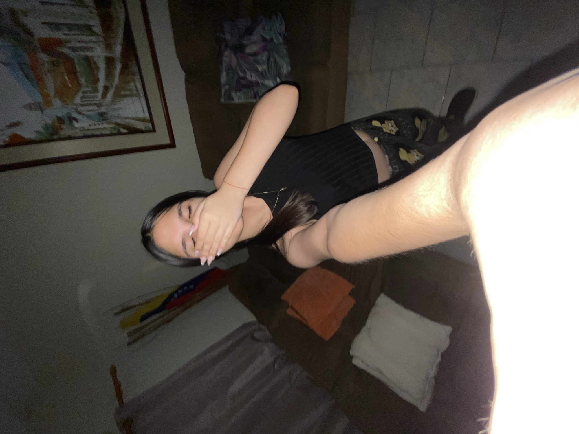A woman lies on a sofa in a room in Cotoperíz, Venezuela. She wears a black top and patterned shorts, and covers her mouth with her hand. The room contains a framed painting on the wall, several pillows on the sofa, and what appears to be the flag of Venezuela.