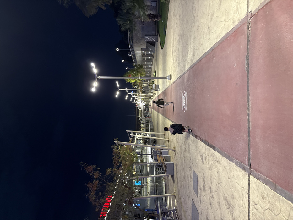 An illuminated walkway at night. A paved path with a red lane runs through the center. Streetlights line the left side of the path, and benches are visible along the edge. Two people are walking along the red lane. Palm trees are visible in the background. The sky is dark and clear.