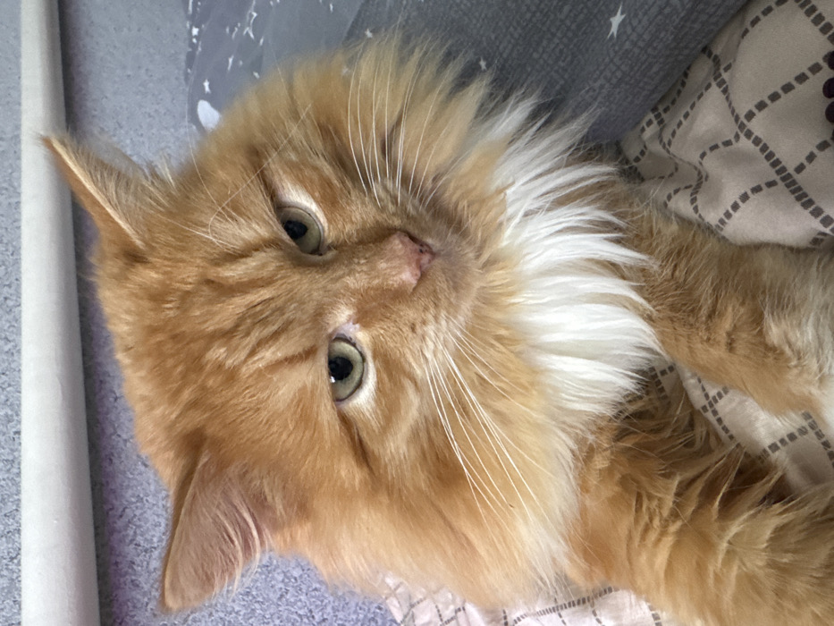- "An orange tabby cat lies on its side, head tilted towards the camera" by FM-RwYZD3, licensed under CC BY 4.0