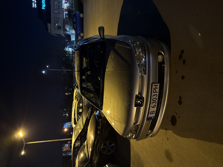 The image depicts a nighttime scene in a paved outdoor parking lot within the city of Varna, Bulgaria. The primary subject is a silver Peugeot 306 Break (station wagon) parked in the foreground, facing slightly towards the viewer and illuminated by a warm, yellow streetlamp light. The vehicle's surface, particularly the hood and roof, shows numerous water droplets, indicating recent rain or condensation. Its front license plate, "B 6303 PH," clearly identifies the vehicle as registered in Varna. The car features a Peugeot emblem on the grille, two headlights, and two circular fog lights. Roof rails are visible on its top. The interior is dark and appears unoccupied, with a small object hanging from the rearview mirror area. Behind the Peugeot to the left, a row of other parked cars is visible, including a dark-colored Audi A4 B6 (identifiable by its wheel design) with a partially visible "B" license plate. Further back in the row, additional vehicles of various models and dark colors are present. To the right and further back, a small blue hatchback is parked near a commercial building. The environment is illuminated by artificial light sources. A tall streetlamp with a bright yellow light stands prominently on the left, casting a strong glow on the foreground. Another streetlamp, emitting a whiter light, is visible further back on the right. The ground is a dark, possibly asphalt, surface with some darker wet patches or puddles visible directly in front of the Peugeot. In the background to the right, a multi-story commercial building is prominent, featuring illuminated signs. Partial text "ТЪРГ. ЦЕНТЪР" (Trade Center) is visible at the top, along with a distinct "Hop.bg" logo. Below, signs for "МАГАЗИН" (Shop) and "ПРАТПАК" (Pratpak) are discernible, indicating a retail complex. To the left, behind the parked cars, a large billboard with partial text is visible. Distant lights from other city structures are visible against the dark night sky. No individuals are present or engaged in any actions within the frame.