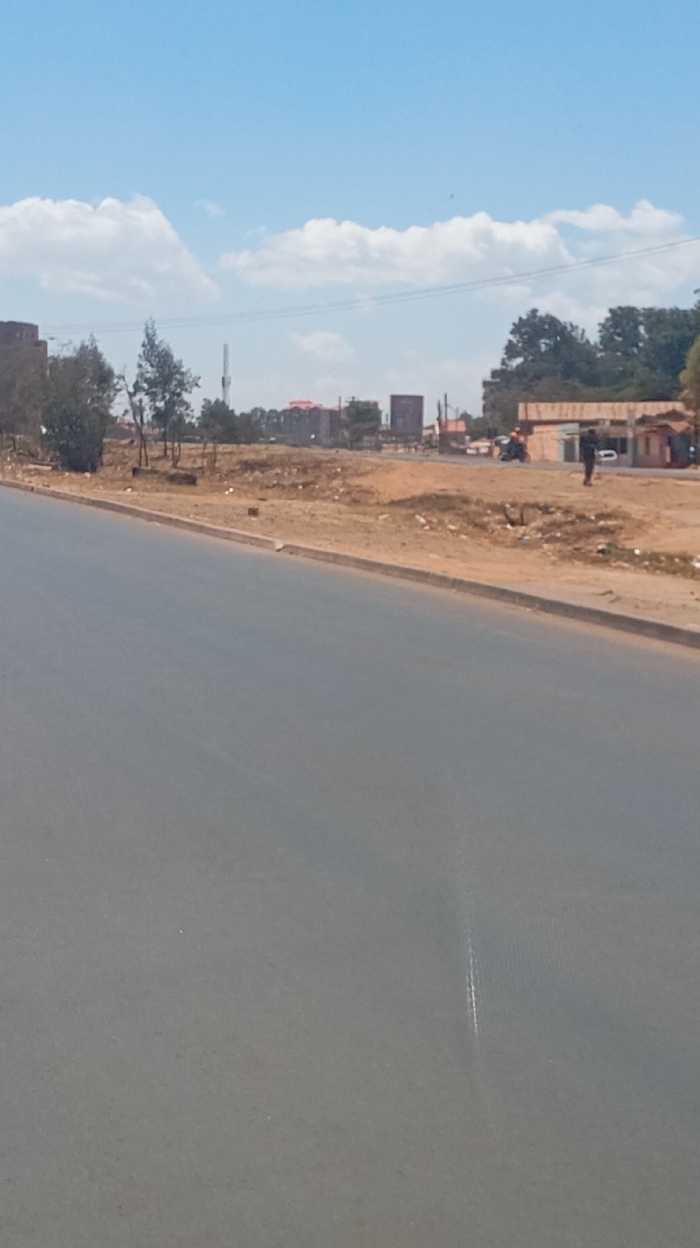 A daytime scene showcases a wide asphalt road under a clear blue sky with scattered clouds. To the right, a dirt shoulder slopes upwards to reveal a sparse landscape with buildings and trees in the distance. A lone figure stands near a structure. The road stretches forward, capturing the viewer's focus. Utility poles are visible against the sky.