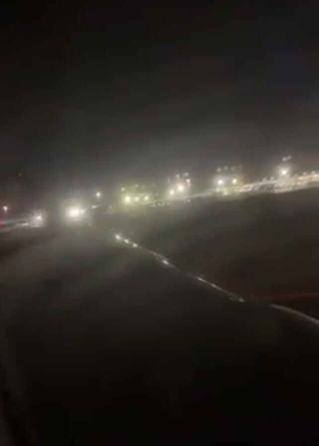 view from an airplane window at night. The wing of the plane is visible in the foreground, and the airport runway can be seen in the distance. The runway is illuminated by bright lights, and there are a few other buildings visible in the background. The sky is dark and cloudy. The plane appears to be moving slowly.