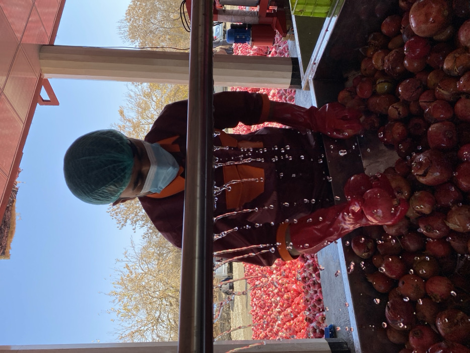 A person wearing a hairnet, mask, maroon coat with orange stripes, and red gloves, stands between a metal pipe and a container filled with red fruits or vegetables. Water streams down from above, dripping onto the gloved hands and the produce. In the background, a pile of similar red items extends outwards, with industrial equipment visible above them. The sky is blue and there are bare trees in the distance. The angle of the image is rotated, causing a slightly disorienting perspective.