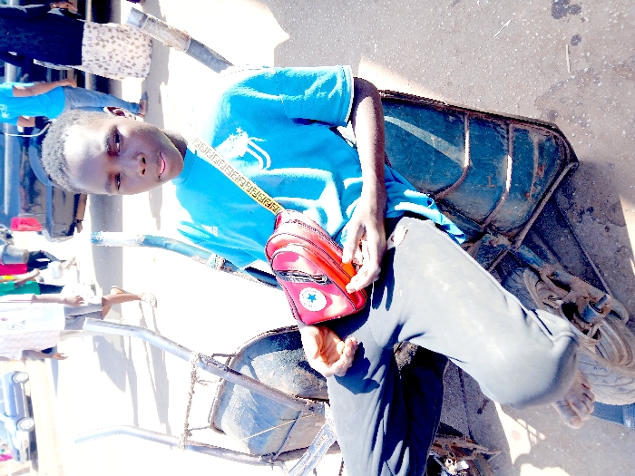 A young male is depicted seated in a dark, possibly repurposed two-wheeled cart on a paved surface in Plumtree, Zimbabwe. The individual, appearing to be a pre-teen, has short dark hair, is barefoot, and wears a light blue t-shirt with a white graphic print, along with black track pants. A red fanny pack featuring a white star logo is strapped across his chest with a patterned strap, and his hands rest upon it. His gaze is directed slightly left of the camera, with his tongue slightly extended. The cart he occupies is metallic, dark-colored with visible wear and rust, featuring two small wheels and two silver-toned metal handles extending upwards. In the background, several individuals are visible walking or standing, including one person in a white striped shirt and another in a blue t-shirt. Two vehicles, a dark-colored sedan and a light blue sedan, are also present in the background. The scene is brightly illuminated by natural sunlight, casting distinct shadows on the ground.