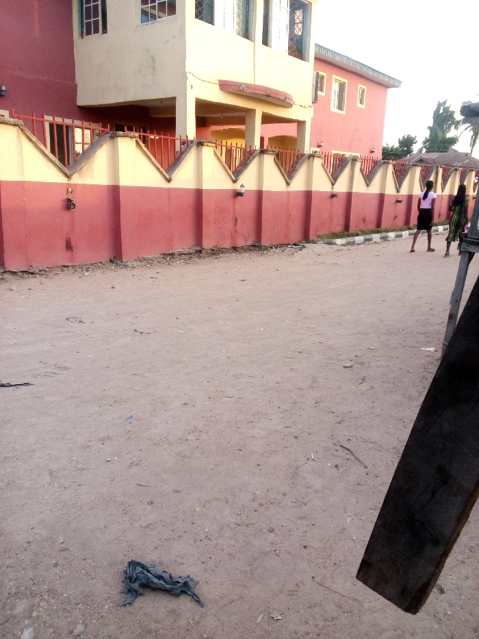 A two-story building stands behind a fence painted red and yellow. Two figures walk along the sidewalk next to the fence. The street in front of the building is dirt and gravel. A piece of black plastic sits in the foreground, and a piece of dark wood is partially visible on the right side of the image. The sky is slightly overcast.
