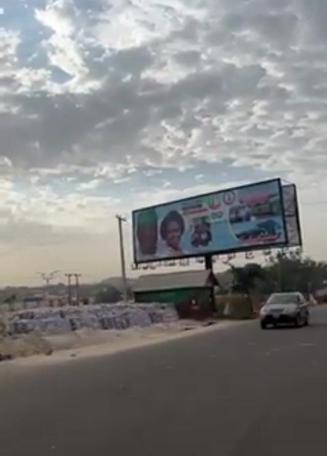 view from a moving vehicle driving on a paved road. The sky is cloudy. The camera passes a large billboard featuring images of two people and the name "MUTYAUANG." To the left of the road, there is a large pile of bagged material. A car passes on the right. The road continues, revealing a distant view of buildings and sparse vegetation.