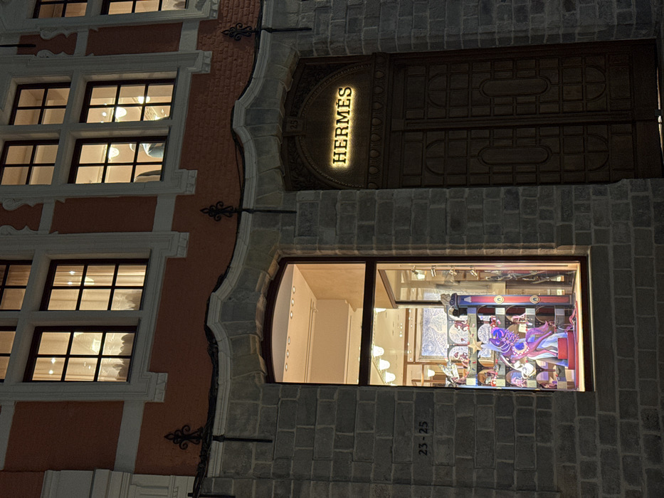 A building facade featuring a store entrance and window displays. The "HERMÈS" sign shines above a closed, ornate wooden door. Below, a large window showcases a bright, colorful display of objects. To the left, a contrasting facade with multiple windows glows with interior light. The building exterior alternates between brick and a lighter, ornate material. The numbers "23-25" are visible near the window's base.