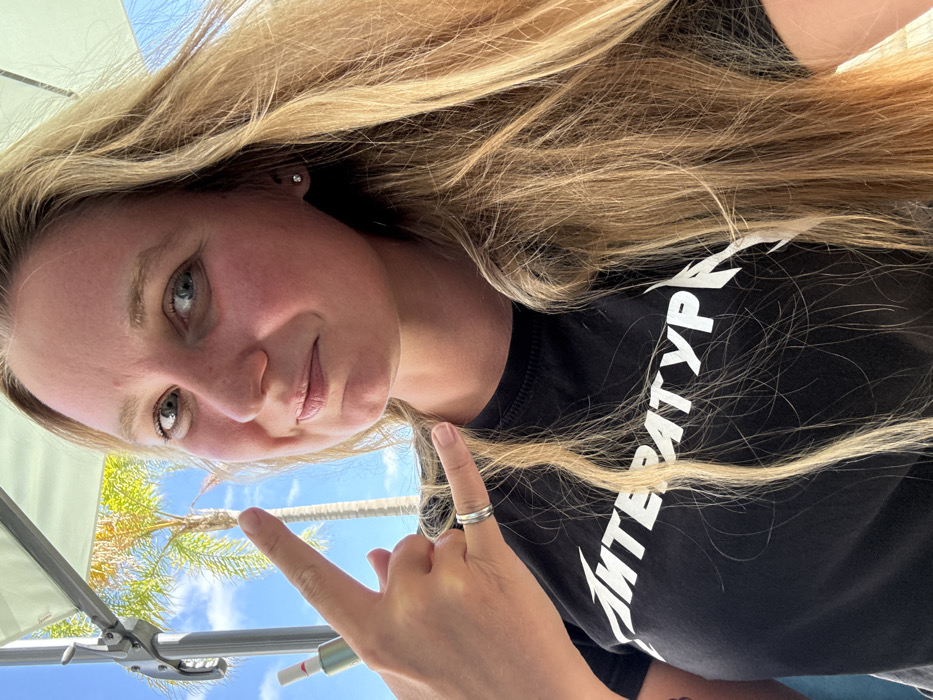A fair-skinned female with long, light blonde hair and blue eyes faces the camera directly, exhibiting a slight smile and facial redness on her cheeks and nose