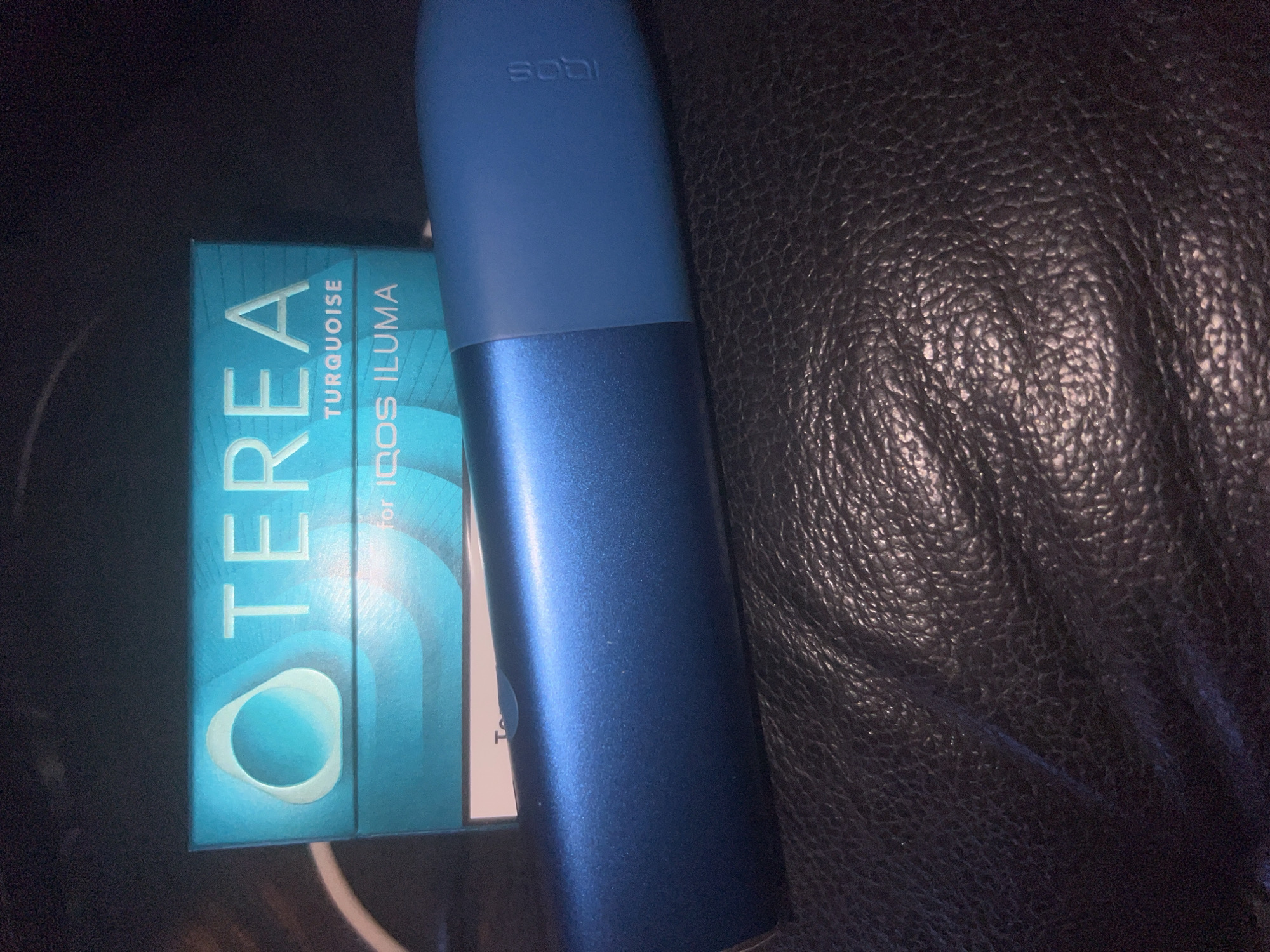 A close-up, static shot features two primary objects: a retail box and an electronic device, positioned on a dark, textured surface. The rectangular box, oriented vertically, is teal/turquoise with white lettering, prominently displaying "TEREA TURQUOISE" and "for IQOS ILUMA." A stylized light teal teardrop or oval emblem is visible on the left side of the box. In front of and slightly below the box, a blue IQOS ILUMA electronic device lies horizontally. The device is cylindrical, segmented into a darker, metallic blue section on the left and a lighter, matte blue section on the right. The "IQOS" logo is subtly embossed vertically on the lighter blue portion. The objects rest on a dark surface consistent with black or very dark brown pebbled leather upholstery. The background behind the box is indistinct and dark. No individuals or discernible actions are present in the frame. The scene is located in Vienna, Austria.