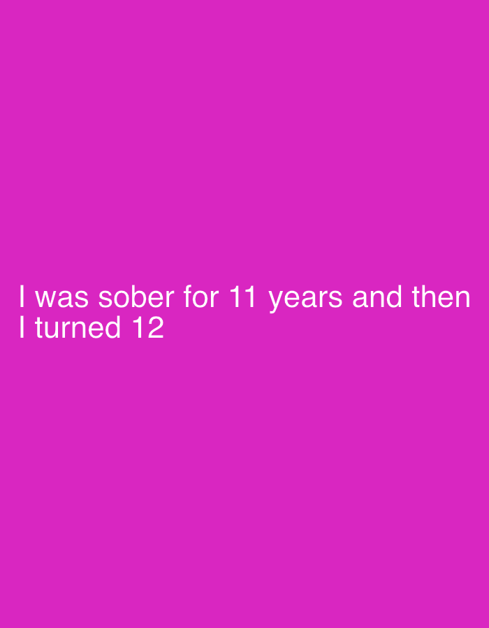 The image is a solid pink background with the text "I was sober for 11 years and then I turned 12" in white font