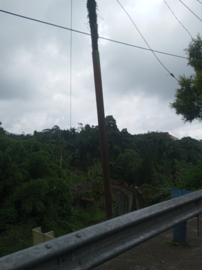 Lush green vegetation covers a hillside under a cloudy sky. A brown utility pole stands in the foreground, intersected by power lines. A winding road descends through the foliage. A gray guardrail dominates the lower part of the image, creating a foreground barrier. The overall atmosphere is overcast and humid.