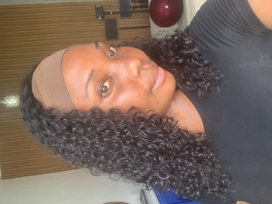 The image displays a close-up, selfie-style photograph of an adult female situated indoors. The subject has dark skin, dark, tightly curled hair extending to her shoulders, and is wearing a plain brown fabric headband positioned above her forehead. She is dressed in a black, short-sleeved, ribbed top. Her eyes are dark, and her lips appear full with a glossy finish. She faces the camera directly, exhibiting a slight, closed-mouth smile. The background indicates an interior space, possibly a residence or studio in Abuja, Nigeria. A decorative light fixture with reflective elements hangs in the upper center of the frame. To the right, a wall features light-colored, vertically striped paneling. In front of this wall, two pieces of black studio equipment, resembling light stands with a rectangular panel on one, are discernible. A light-colored sofa or couch is partially visible, holding a dark red, spherical cushion with a central reflective ornament. A blue fabric object and a light-colored surface are visible on the left side. The specific location within Abuja cannot be determined beyond an indoor setting.