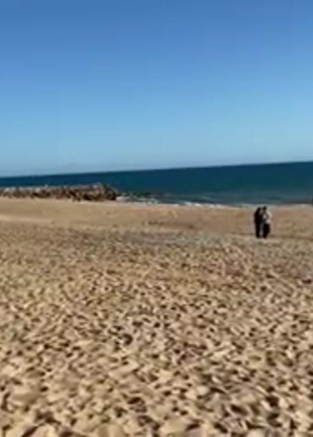 The scene is a sunny beach with a clear blue sky. The sand is a light tan color, covered in numerous footprints. Several people are scattered across the beach, some closer to the water and others further away. The water is a deep blue, with the sun reflecting off the surface, creating a bright glare. A breakwater of rocks extends into the ocean, with a few figures visible on top of it. The overall impression is a calm, relaxed beach scene.