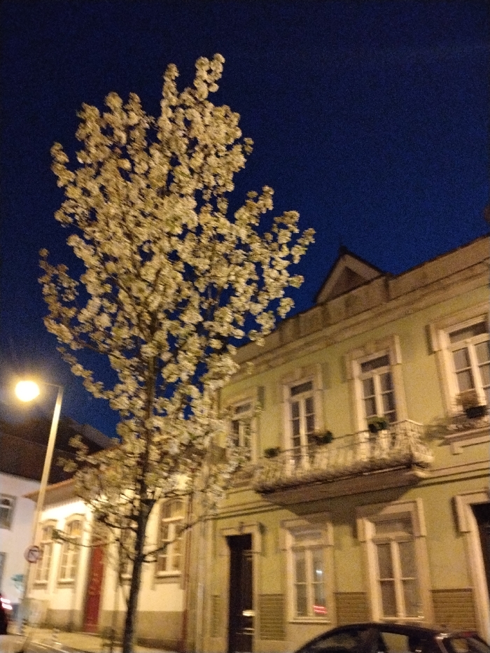 This image depicts a nighttime urban street scene in Braga, Portugal. The prominent feature is a deciduous tree in full white blossom, centrally located and extending towards the top of the frame against a dark blue twilight sky. To the right, a multi-story building with a pale green or yellow facade features multiple rectangular windows with white frames, a prominent second-floor balcony with ornate white wrought-iron railings, and plant pots visible on the balcony and window sills. The building's roofline includes a decorative pediment. A dark-colored doorway is visible on its ground floor. To the far left, a streetlamp emits a bright yellow light. Another building, lighter in color with red-framed elements, is partially visible further down the street on the left. A dark-colored vehicle is partially visible in the bottom right foreground. No individuals are discernible within the frame.