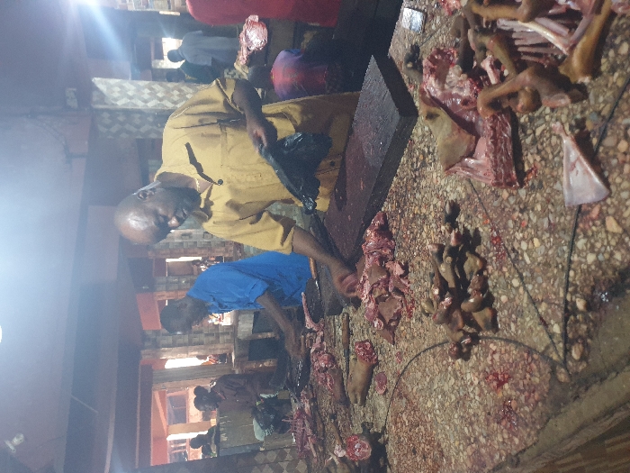 An indoor scene within a market in Nkpor, Nigeria, depicts multiple individuals engaged in meat preparation