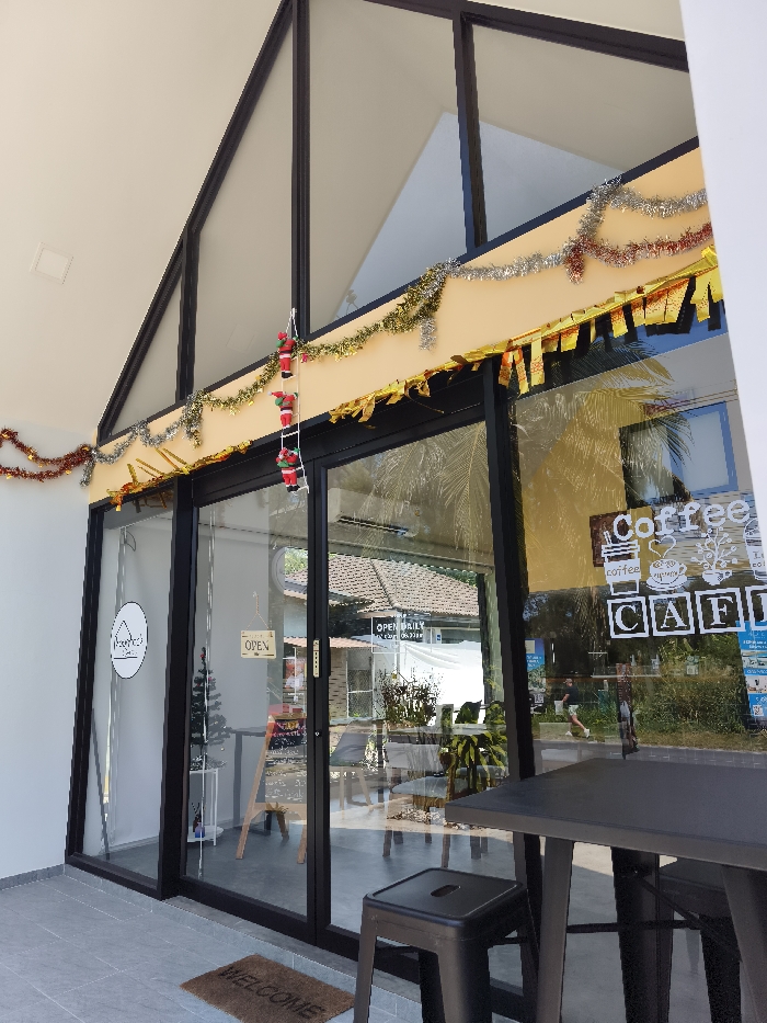 A cafe's entrance is visible. Black-framed glass doors and windows form the facade, decorated with holiday tinsel and a climbing Santa decoration. An "Open" sign hangs on the door. Reflections reveal the cafe's interior with tables and chairs, and a sign reading "Coffee CAFE." A dark table with stools sits outside the entrance on a gray tiled surface. A welcome mat lies near the door. The building's architecture features a triangular window above the entrance.