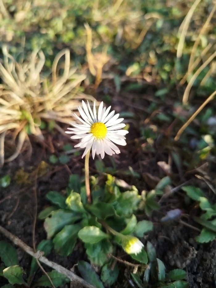 The scene depicts a single, fully bloomed common daisy (Bellis perennis) positioned centrally in an outdoor, natural ground environment in Unknown, Unknown