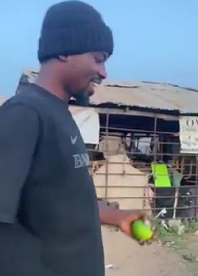 A man wearing a black beanie and black shirt walks through an outdoor market. He smiles at the camera briefly before continuing to walk by the storefronts. He is holding a green fruit in his hand. The shops are covered with metal roofs and some have Coca-Cola advertisements.